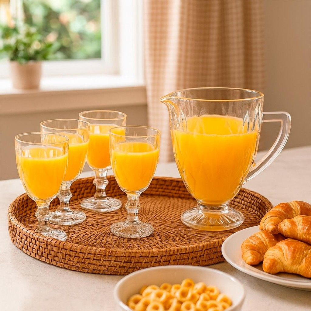 Uma jarra bonita e taças combinando mudam completamente o momento de servir — água, sucos ou drinks ficam com outra presença.