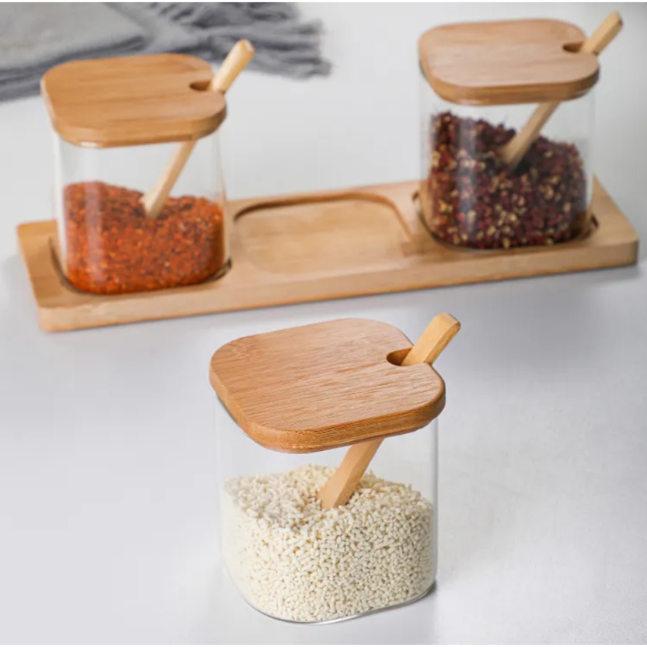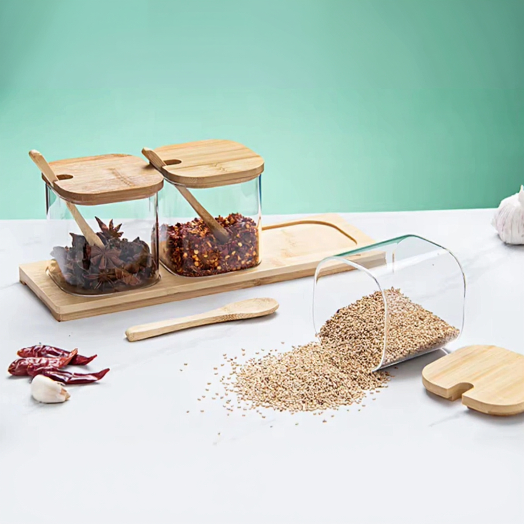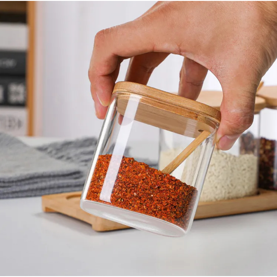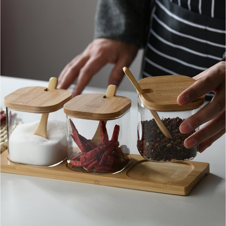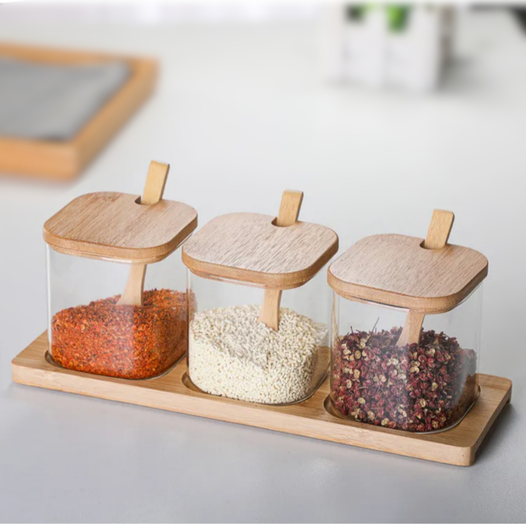 Kit Porta-Temperos com 3 Potes de Vidro e Tampa de Bambu – Bancada Organizada e Cozinha Mais Elegante