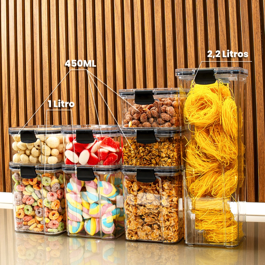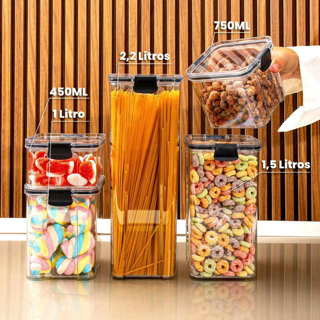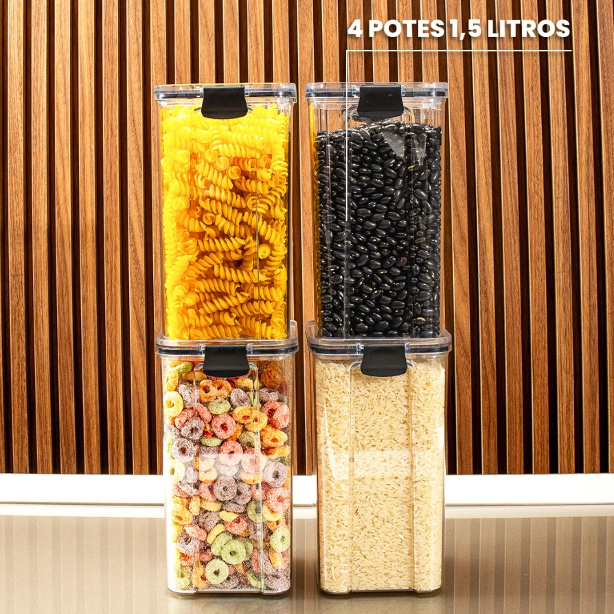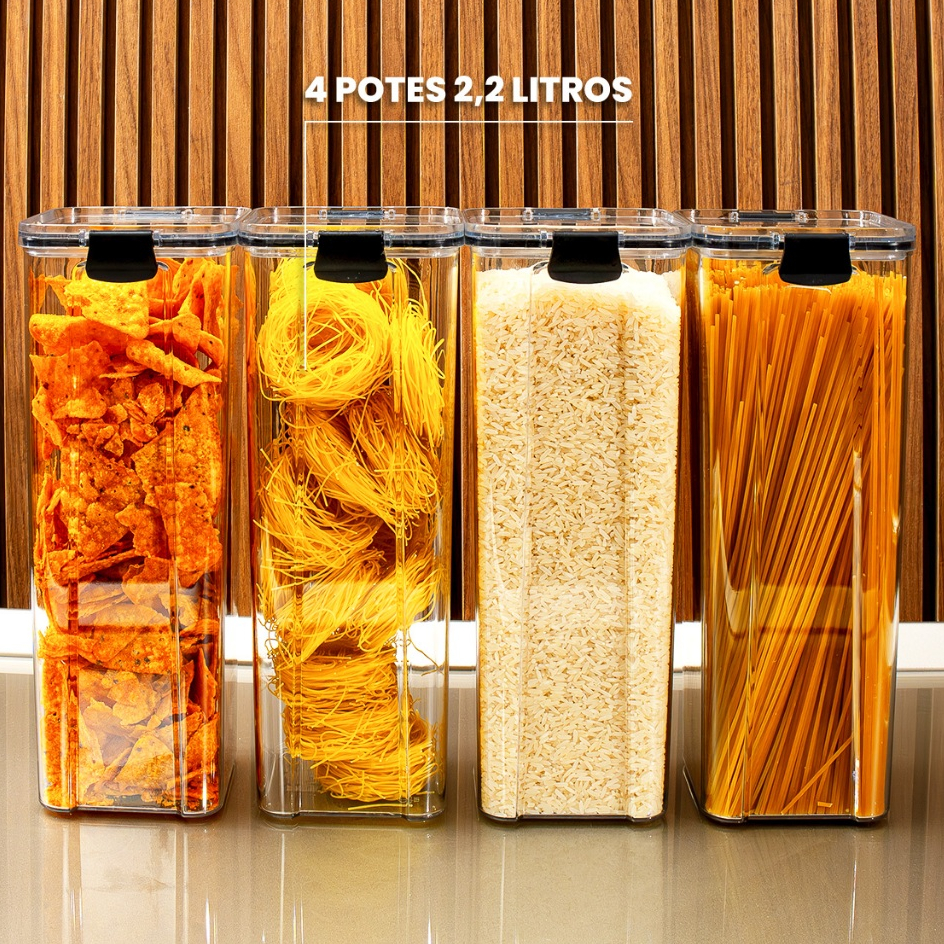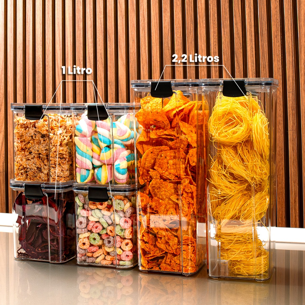 Os potes são indicados para grãos, cereais, massas, farinhas, açúcar, café, arroz, feijão, snacks e outros mantimentos secos.